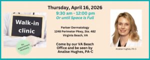 Do you have a skin spot that needs to be seen sooner rather than later? Or, have you been putting off your annual skin exam? Come by our Virginia Beach office on Thursday, April 16th. Beginning at 9:30 am until noon or until space is full, Analise Hughes, PA-C will examine your skin.
